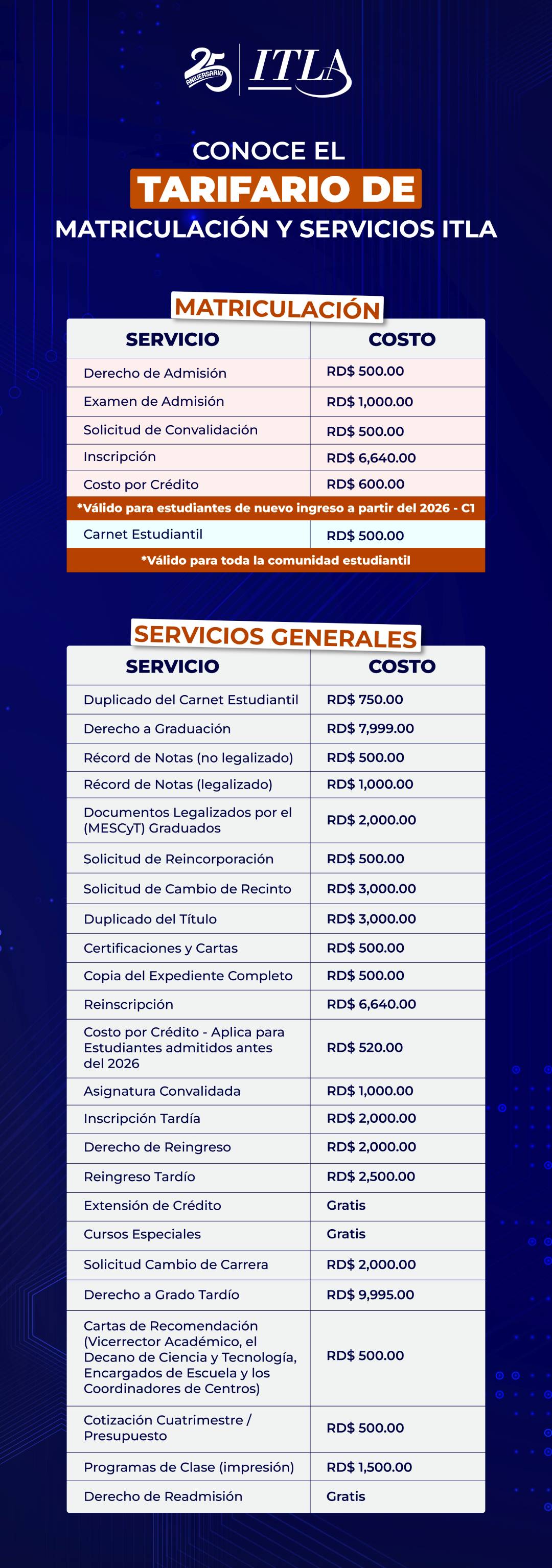 <p>Derecho de Admisión RD$500.00 , Examen de Admisión RD$1,000.00 (Ambos montos no reembolsables).</p>
